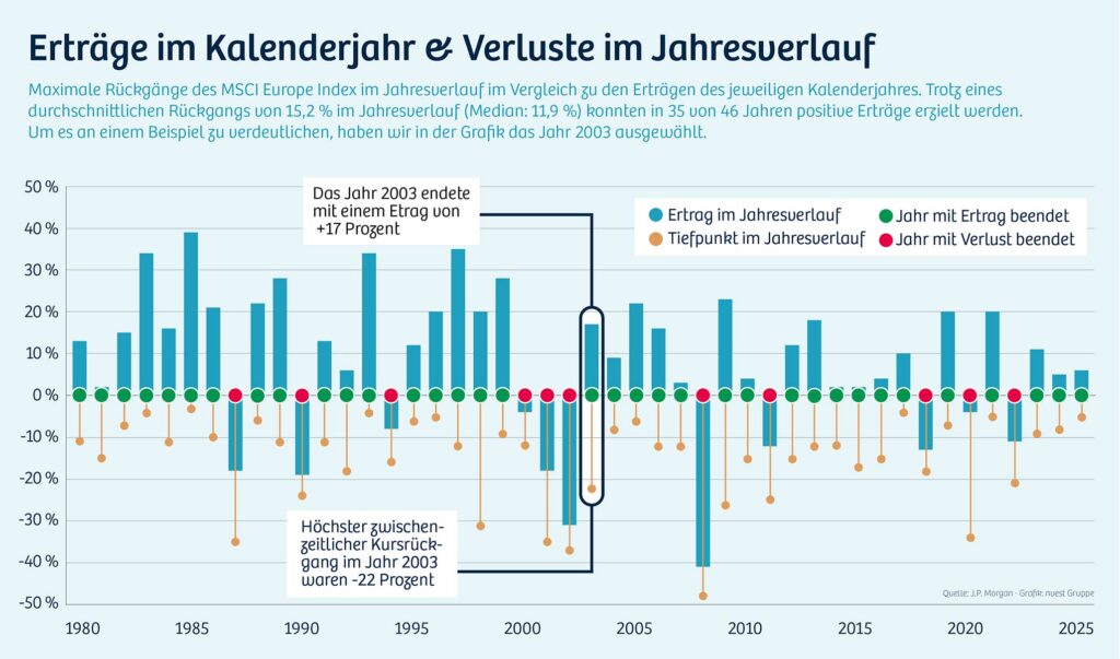 Eine aktuelle Grafik von J.P. Morgan, die wir für Sie aufgearbeitet haben, macht dies deutlich: In zahlreichen Jahren kam es im Jahresverlauf zu deutlichen Rücksetzern – teils zweistellig. Und dennoch schlossen viele dieser Jahre mit positiven Renditen ab oder zumindest deutlich über den zwischenzeitlichen Tiefstständen.